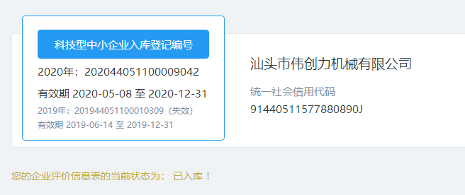 我司汕頭市偉創(chuàng)力機(jī)械有限公司被評(píng)為2020年全國"科技型中小企業(yè)"