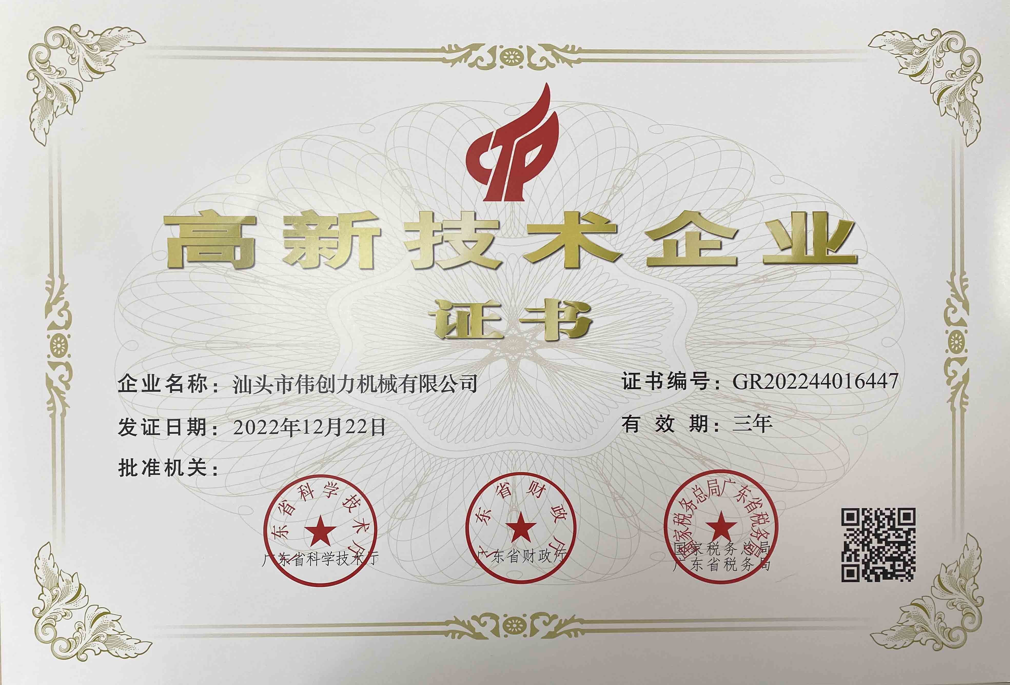 春光作序,萬象更新,汕頭市偉創(chuàng)力機械有限公司喜獲佳音。憑借專業(yè)的研發(fā)團隊、雄厚的技術實力、持續(xù)的創(chuàng)新能力、科學的企業(yè)管理,經(jīng)全國高新技術企業(yè)認定管理工作組織的嚴格審查,我司順利通過了高新技術企業(yè)認定,成功獲得"高新技術企業(yè)證書",由此正式邁入國家高新技術企業(yè)行列,可喜可賀!